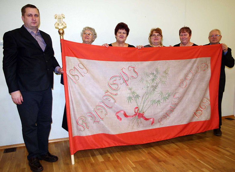 Lauluseldsi esimiis, ettevõtja Lina Kalmer ütel’, et kukki vana lipp om Eesti tiatri- ja muusigamuusõumin olõman ja pronksist lüüra kujoga lipuots kingiti seltsile kah tagasi, lää-s lipu perrätegemine laapsahe.