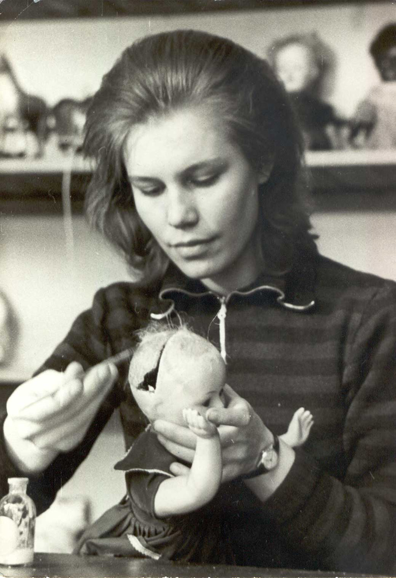 1960. aastil oll’ mängoasjo veidü ja nuu olli kalli. Latsõ hoitsõ ummi lemmikit väega ja ku mõni katski läts’, oll’ ikmist pall’o. Sis tull’gi pupipolikliinik appi. Pildi pääl om nätä, kuis pupitohtri Urbaniku Elviira tege 1964. aasta keväjä kõrda pupi, kelle pää om kõvastõ vika saanu. Pupipolikliinikun tetti kõrda ka pehmit eläjit, massinit, rõivit jne.