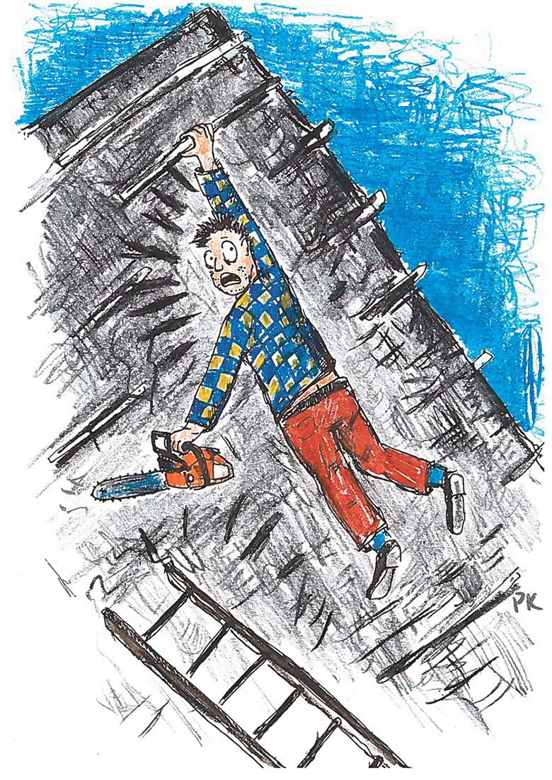 Jäti ruttu sae saisma, haari õnnõs hüä käega ülemädsest liistust kinni ja kuraga pidi iks saagõ kinni, et alla es sadanu. Kahjo kah saest, ku alla lindas ja katski lätt – kallis asi.