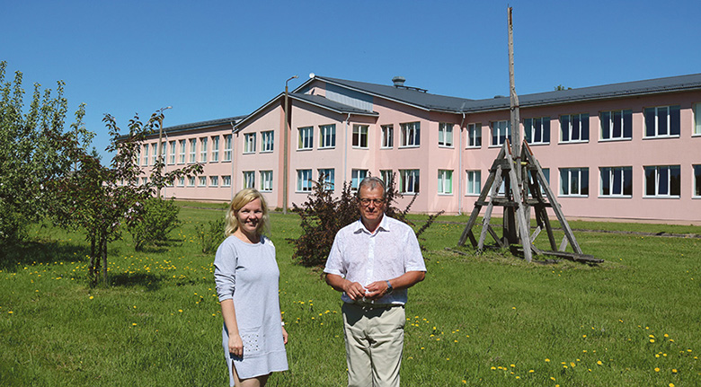 Parksepä kooli huvijuht Pütsepä Airi ja direktri Kesselmanni Ilmar koolimaja takan uibuaian. Rahmani Jani pilt.