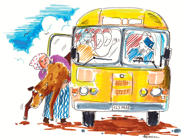 Üte talo värte man pidäsi üts memmekene bussi kinni ja pallõl’ hinnäst kuun õhvakõsõga bussi pääle võtta. Täl kokko lepütü, et vii eläjä kokkoostu. Muidoki küsse Madis sõitjidõ käest lupa ja ku tuu käen, avitõdi eläjäkene tagaussõst sisse ja läts’ sõidus.