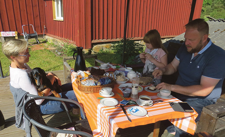 Külli, Tuuli Ann ja Urmas hummogusöögilavvah terrassi pääl. Säinasti Ene pilt.