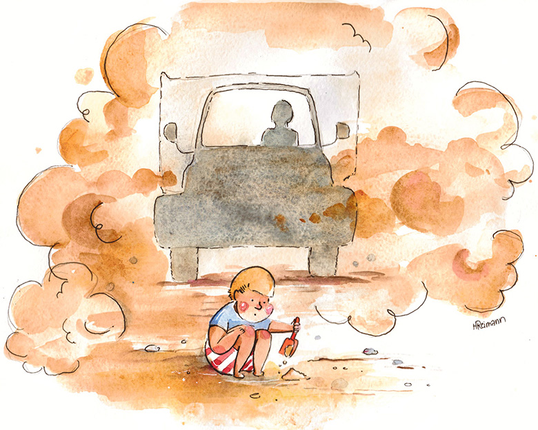 Tuul pääväl sõidiva mi maja iist müüdä ütstõsõ takan suurõ massina liiva ja ruusaga – sääl takanpuul midägi ehitedi. Kavvõmbast näi, ku kallaja läts’ müüdä, tolmupilv nõssi taivani. Sis näi, ku majaussõst tull’ vällä naabri väikene poig Alar (4–5 a), kühvlikene käen, ja läts’ õkva tii pääle sinnä tolmu sisse. Suurõtii päält nakas’ mi tii pääle käändmä järgmäne suur massin. Mi tii kotsil oll’ iks suur tolm nigu pilv.
