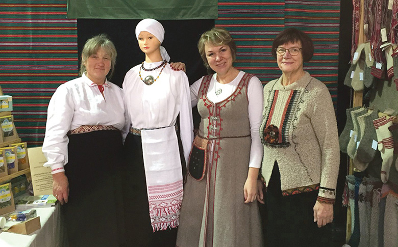 Vana-Võromaa käsitüümeistri Pedäjä Reet, Oja Vilve ja Kulla Maia Tal’nan timahavadsõ mardilaada pääl.