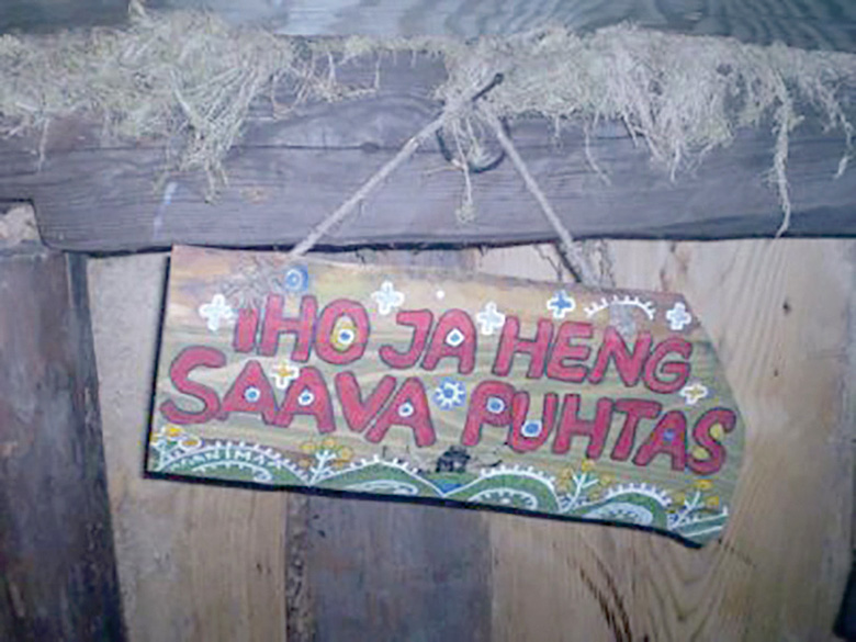 Meelüsses või passi ka sannaga köüdet umakeeline silt. Pilt kodolehe savvusann.ee päält