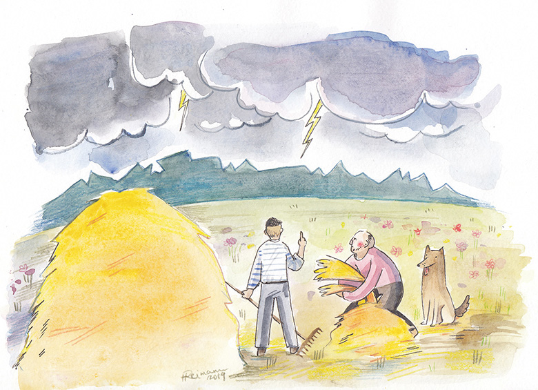 A oh hätä, üüse nakas’ müristämä ja vihma sadama. Kotusõ pääle kihot’ kõva piksetorm. Räüssä tull’ kah ja murdsõ külä pääl hulga puid maaha. Mõnõ puu olliva välgiga pilvastõs pestü ja mustas kõrbõnu. Kundiotsa maja sai ka välgist külge, õnnõs inemise vika es saa. Esiki aiakraami oll’ räüsätü.