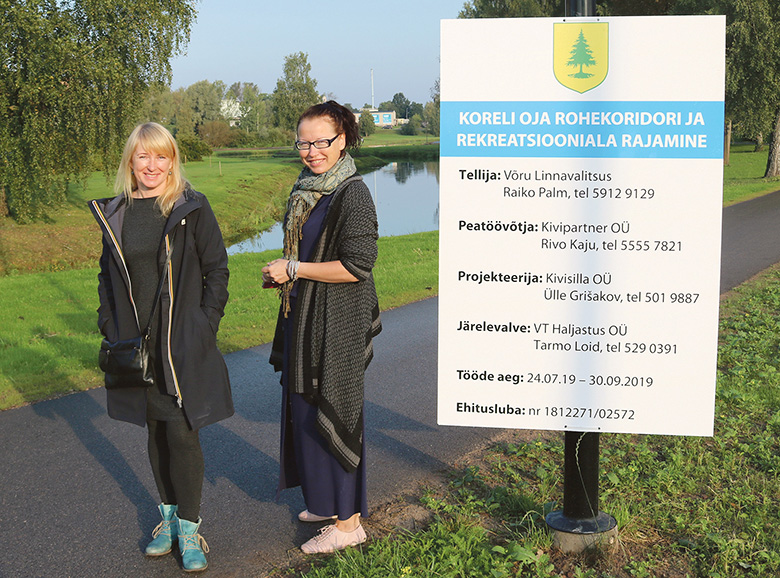 Võro liinavalitsusõ arõndusnõunik Hallimäe Tiina ja Võro liina hall’astusõ ja liinakujondusõ as’atundja Vahtla Anne Korõli uja veeren paigan, kohe pia istutõdas paiupark. Rahmani Jani pilt