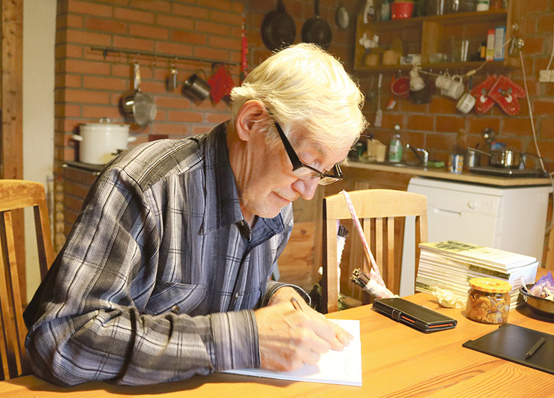 Kiränik Kaplinski Jaan umalõ vahtsõlõ võrokeelitsele raamatulõ autogrammi kirotaman. Rahmani Jani pilt