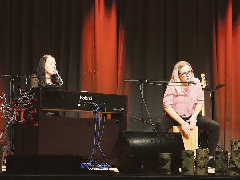 Hellamaa Sirli (hääd kätt) üten sõsara Kerliga (klavõri takan) laulu ette kandman. Urbasõ Ülle pilt