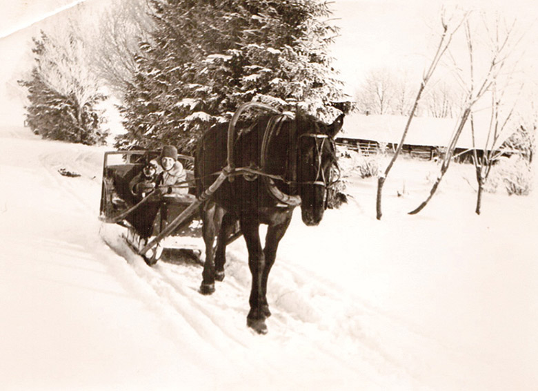 Ku oll’ väega külm ja tuisas’, võtsõ mõni hobõsõmiis koolilatsõ rii pääle. Pildi pääl sõidutas üts hobõsõmiis pinni. Pilt Urmi Aili pildikogost.