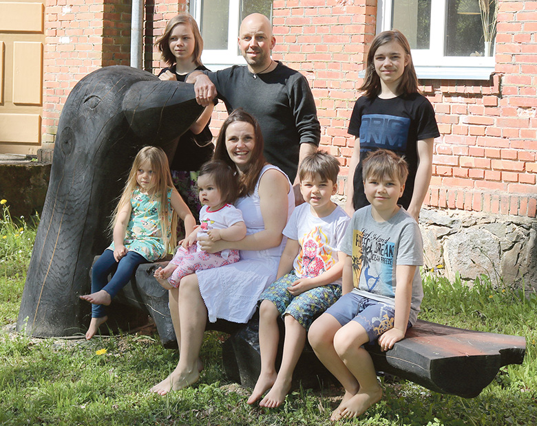 Alevi kuvvõ latsõga pere kodotarõ iin Kaarnakivi puupengi pääl. Saisva Kaspar, pereesä Aivo, Aaron, istva Esmeralda, pereimä Merike üten Rosannaga, Artur ja Joonas. Rahmani Jani pilt
