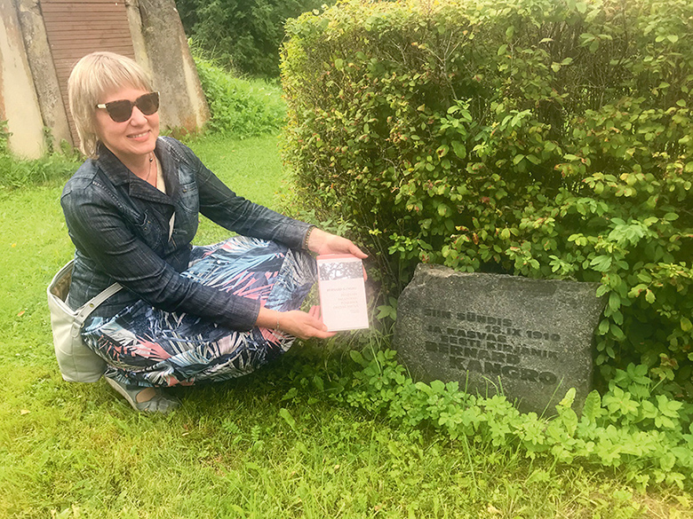 Projektijuht Allasõ Tiia Kangro armatusluulõ-raamatuga timahavva põimukuu lõpun Oe külän Kangro Bernardi mälehtüskivi man. Lendsaarõ Külli pilt