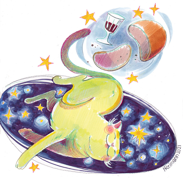 Meeta nõst üte potska lavva pääle, lõikas käärü leeväpätsi otsast, pand õukatopsi kõrvalõ. Ku nüüd asi illos, tege üte topsi, haukas leibä pääle ja tükk aigu om vakka, õnnõ hingämist ja kellä tiksmist om kuulda. Tseieri näütäse kümnendät õdagutunni.