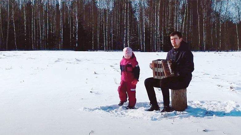 Ojasaarõ Toomas laul videon lõõdsaga «Mõtsavahi luku» ja timä ümbre kepsutas tä tütär Triini. Pilt Marga Janeki tettüst videost