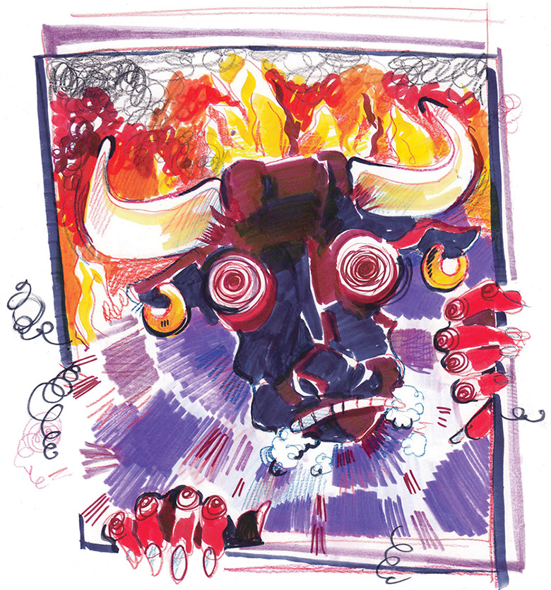 Äkki tull’ kurat magamistarõ suurõ piigli sisse: oll’ nigu hirmsa suurõ hüdsimusta pulli pää, silmä verevä, suu vatunõ, ja mörisi kõva helüga, et midä miis timä käest taht. Jaan oll’ hirmust kangõ ja es olõ mõistnu midägi muud, ku nakanu meieisapalvõt lugõma. Kurat oll’ viil mörisnü ja nakanu nigu väiksembäs jäämä. Sõs oll’ Jaani sällä takast valgus paistnu, valgusõ sisse ilmu maani valgõn rüün naistõrahvas ja ütel’, et ärku peläkü inämb midägi, tä om kaitsõingli. Aigupiten kattõ kuju är. Tuu aoga oll’ ka kurat kaonu.