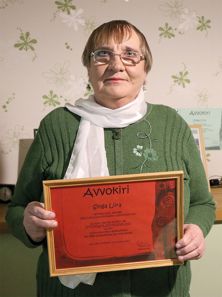 Timahavadsõ jutuvõistlusõ võitja Liira Singa võiduavvokiräga. Rahmani Jani pilt