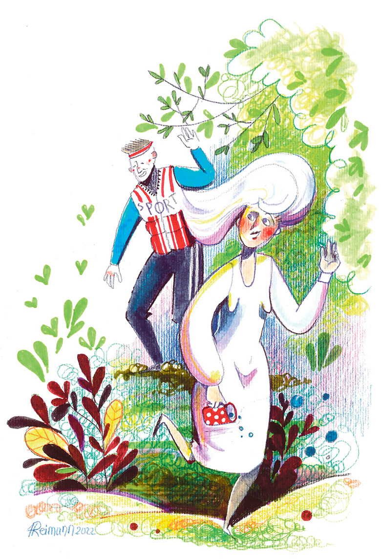 «Vai jummal,» ohas’ miis imehtüsest. «Seere nigu libarebäsel! Vot ku säändse hindäle naasõs saassi!» mõtõl’ tä igätsüsega. «Veidü noorõkõnõ jo paistus, a miä tuust,» kukas’ tä hindä katsildõmõtlõmisõ õkvalt ümbre. Tekk’ hoobis otsusõ, et masku mis mass, näio tulõ umalõ mõrsjas võtta. «Mullõ sääne iks är ei ütle,» oll’ miis kimmäs. «Illos ja rikas kosilanõ, nigu ma olõ.» Märgot’, et kalli joosukängä muatsõs ommava saanu, ja sai viil kimmüst mano. «Vaivalt siist sita seest tõist musugust löüda või. Kül tulõ rõõmsahe üteh – miä taah pommihavvah iks tetä om.»