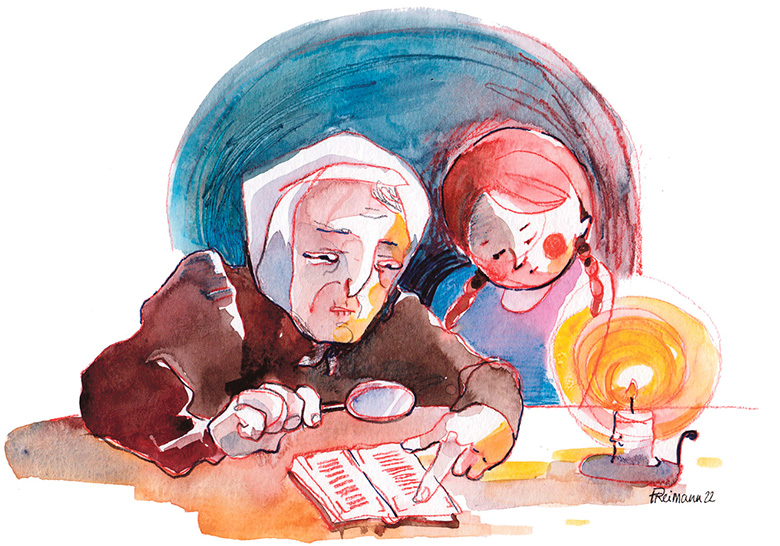 Vanavanaimä lugi sakõhe kõva helüga ummi kerkoraamatit. Nuu raamatu olli kirotõdu muidogi kõvõridõ gooti tähtiga. Prille vanavanaimä es kanna. Täl oll’ sääne kolmõsentimeetridse läbimõõduga lühkese metalltoro sisse pant suurõndusklaas, midä tä silmäs kutsõ, ja tollõga tä lugi. Ma olli täl kõgõ nõnnapite man. Tassakõisi naksi küsümä, mis täht tuu om ja mis täht tuu om. Olli sis vast nii kolmõ-neläaastanõ. Vana-vanaimä lubasi noid raamatit latsõl kiilmädä kätte võtta, kuiki nuu olliva sis joba peris vana. Ja nii es saa nigu arvogi, ku ma ütskõrd näid lukõ mõisti. Viiendä eloaasta algusõs oll’ gooti kirän lugõminõ joba peris laabsa.