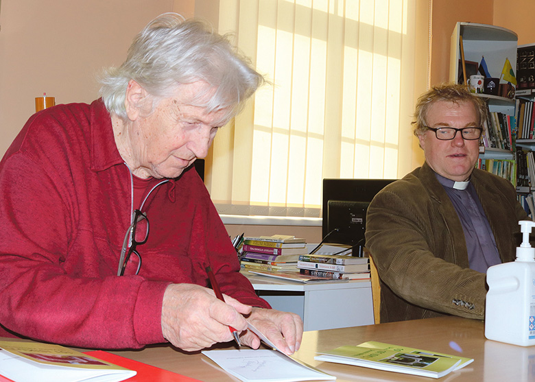 Raudsepä Vambola kirotas raamatulõ autogrammi, takastpuult kaes Salumetsa Üllar. Pilt om tettü 13. mahlakuul raamadu näütämisel Kuldri raamadukogon. Rahmani Jani pilt