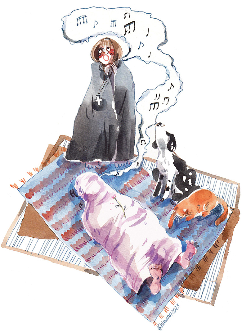 Kuna latsõ üttegi matussõlaulu es tiiä, jorotõdi ütte latsilaulu pikält, vinüvält ja umbõlõ hallõlt. Pinigi naas’ üten ulgma. Kuna «leinäliidsi» oll’ üts, tull’ «koolnul» laulmisõ man kõvva perrä avita, et matus matusõ mõõdu vällä annasi.