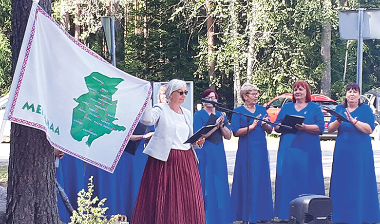 Pildi pääl näütäs Mehkamaa kultuuriseldsi vidäjä Roobi Katrin vahtsõt lippu, tedä tugõ tuu man paiklik naisiansambli HarMõn.