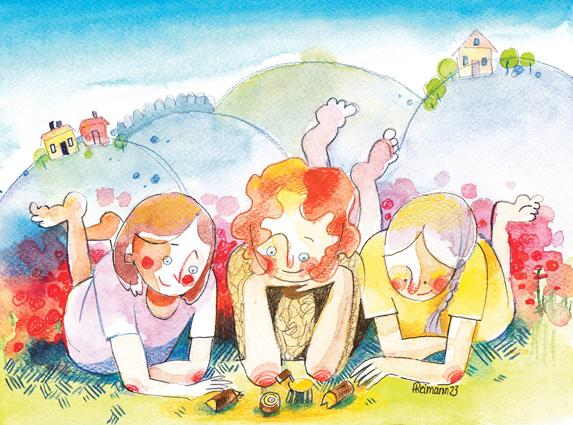 Üleaidsõ peren oll’ kats plikat, kellega oll’ hää kuun mängi, ku vanaimä lubasi. Vahel harva juusksõmi ütstõsõ poolõ ilma vanaimä tiidmäldä. Ku mamma hõigas’, hiilsemi ümbre mäe kipõstõ tagasi. Kõrd oll’ majan. Põhilidsõlt mängsemi trihvaad, käkmist, mäest üles ja alla juuskmist. Ostõtuid mänguasju meil es olõ. Olli imä koetu ja heegeldedü pupi ja vanaesä tettü puust hobõsõ, lehmä, lamba, pini, kassi. Mängsemi kotu, puuti ja kuuli.