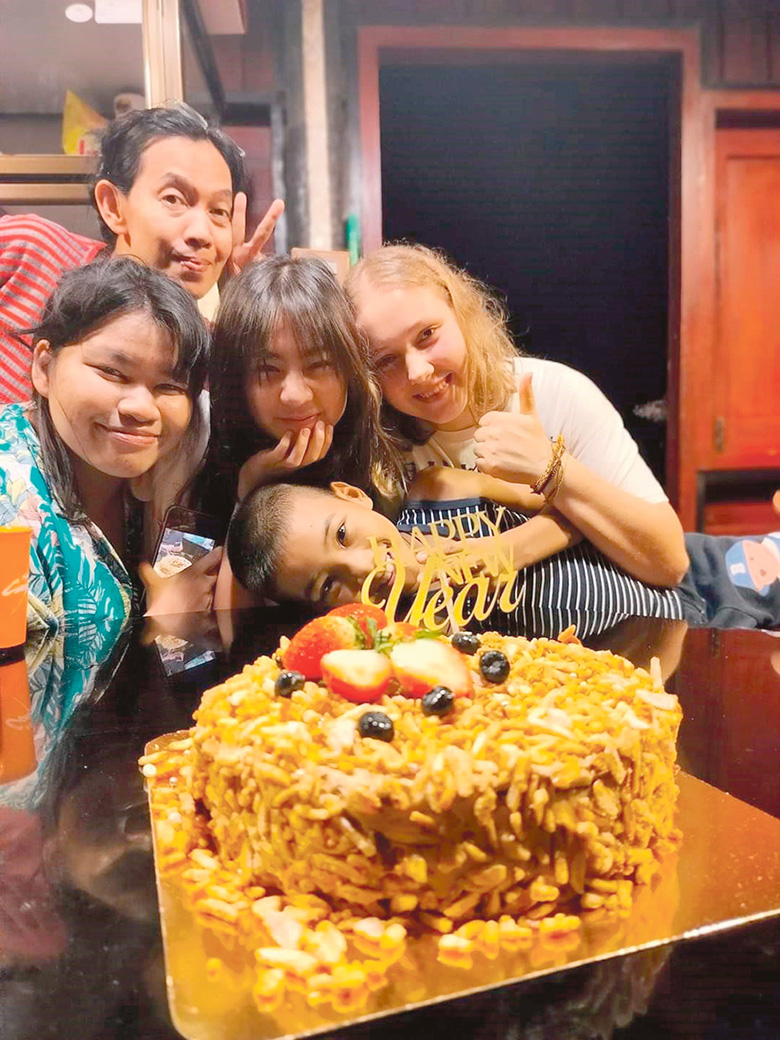 Vahtsõaastatort vaihtusperren: tordi ümbre omma vaihtusimä Mary, naabri Eve, sõsar Khaopun, väiku veli Naprang ja Hellä.