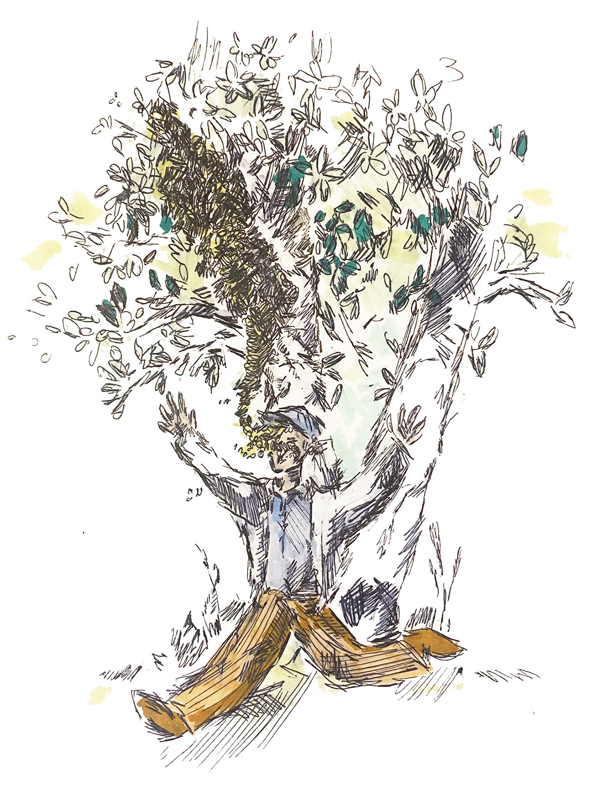 Naabrimiis, kes näkse mi pääldäolõkit, tull’ kaema, kuis meid avitõdõ. Tä kõndsõ paar kõrda ümbre puu ja arvas’, et mis muud, ku tulõ toimõndama nakata: kässe tuvva sülemikasti, käsüt’ Kusta jäl lõhmusõ otsa, saistas’ kastiga tuu ossa kotsalõ, kon süllem korgõl jorisi, ja kässe Kustal jalagõ põruta. Ku tuu mats käve, sattõ tummõ pilv kasti, naaabrimehe Alfredi pähä, sälgä, rinna pääle. Alfred oll’gi esi üts podisõv süllem. Hiitümi innäst kangõs. Naabrimiis oll’ rahu esi: saisõ nigu postament, es köhätä kah.