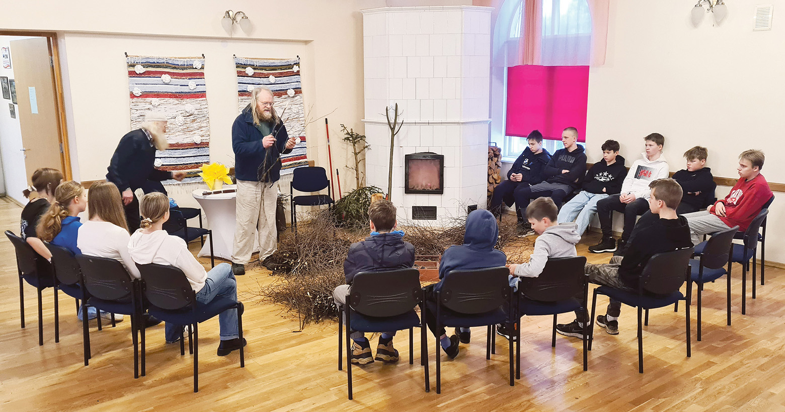 Haanimehe Hollo Agu ja Rätsepä Aare oppasõ koolilatsilõ kogokunnatunnin luvvategemist. Koka Aire pilt