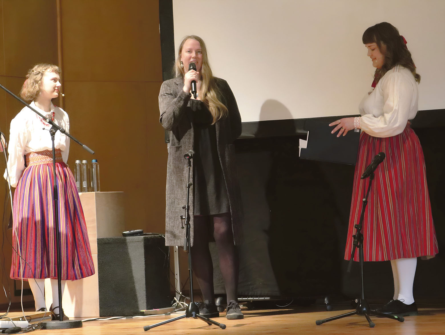 Savvusanna lavvamängu näütämine. Projekti vidäjä Piiri Helen kesken ja pidopäävä juhi Raju Eliisabet ja Saarõ Hipp viiri pääl.