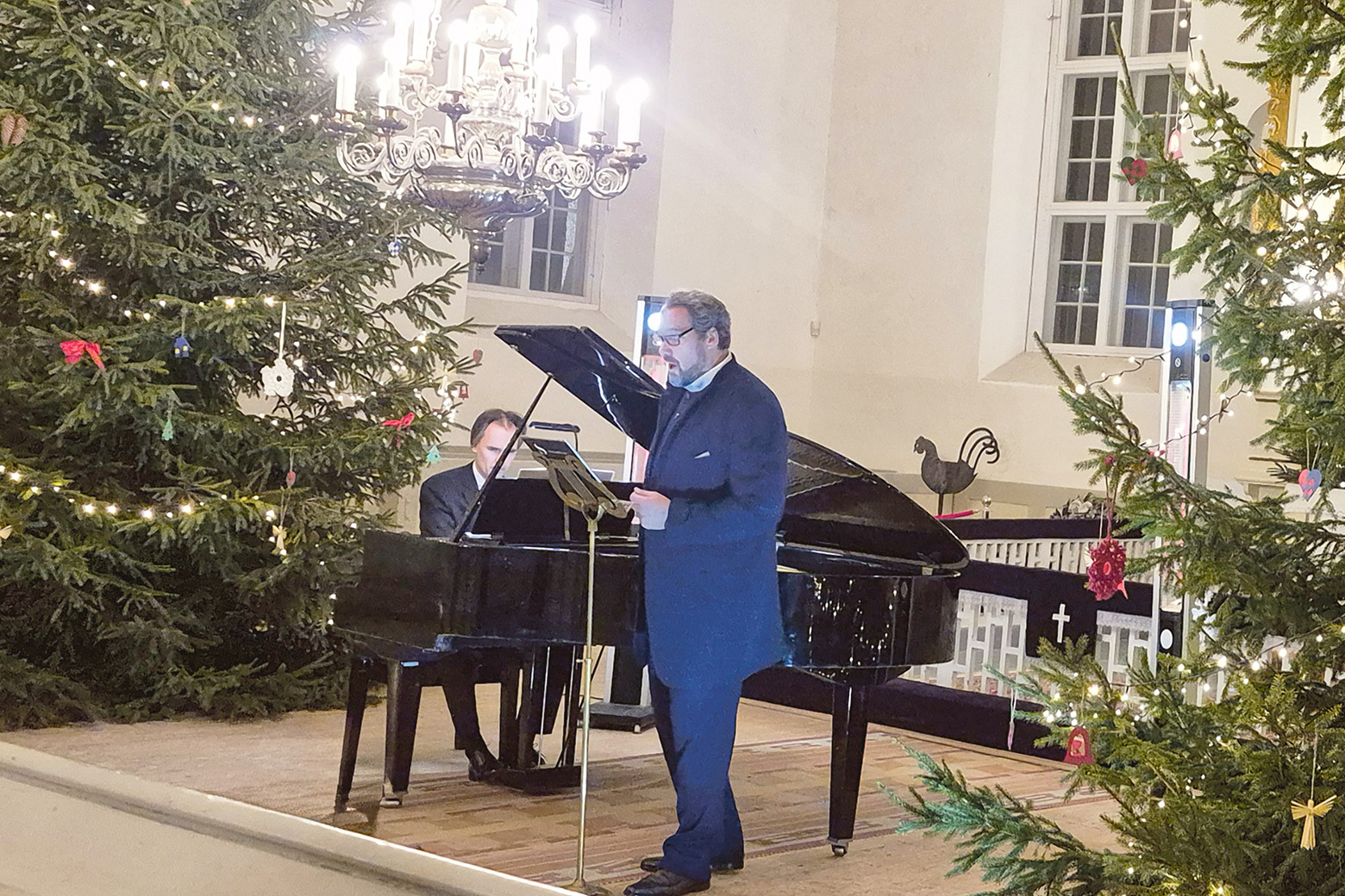 Laulja Angeri Ain ja klavõrimängjä Polli Mihkli Rõugõ kerikun laulutsüklit «Talvinõ tiikund» ette kandman. Rahmani Jani pilt